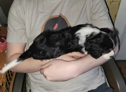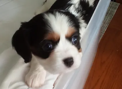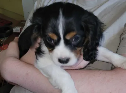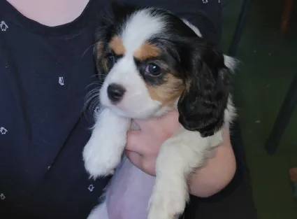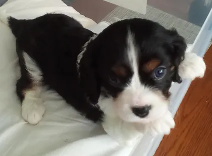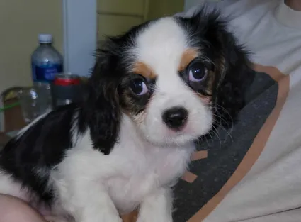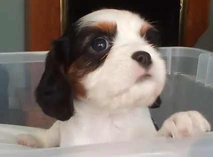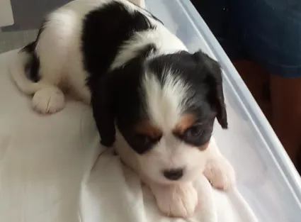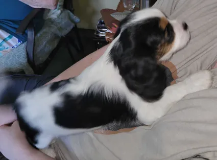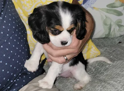 Sally is a female Tricolor (black, white, and tan) Cavalier puppy.